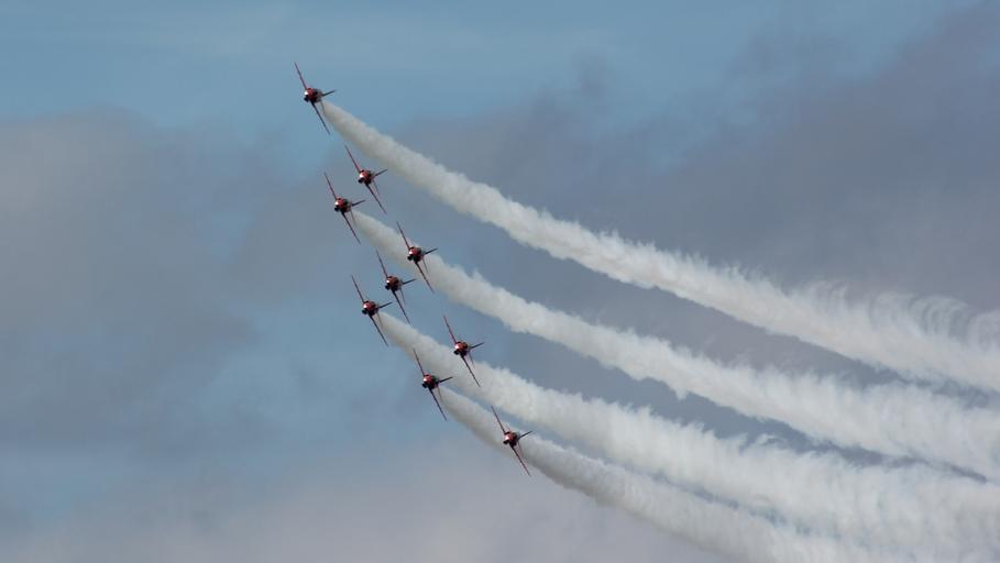 Keywords: planes red arrows display show entertainment aeroplane vehicle aviation flight airplane smoke airshow flying formation aircraft stunt aerial teamwork performance