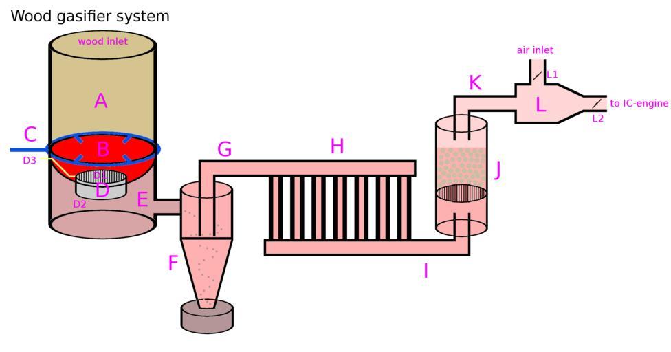 Keywords: Planet Mechanics wood gasifier.png en A schematic showing the wood gasifier built by Dick Strawbridge and Jem Stansfield for the show Planet Mechanics Parts A wood B fire C air inlet air going to 4 nozzles D reduction zone; contains charcoal; smoke goes trough the accumated charcoal and reacts with it H20 and CO2 becomes H2 and CO D1 top grating movable D2 lower grating not movable D3 handle used to stirr up the wood to provide evenly high temperature over top grating E smoke F single-cyclone seperator coarse filter G partially filtered smoke H radiator reduces heat of gas and hence condenses the gas making it more flammable/potent I cooled partially filtered smoke J fine filter consisting of clay balls on top of a grating K wood gas fully filtered cooled smoke L air/gas mixer replaces IC engine carburator L1 air inlet valve operated via handle mounted to gear stick L2 choke valve own KVDP 2011-04-18 Cc-zero Wood gas Wood-gas-powered vehicles