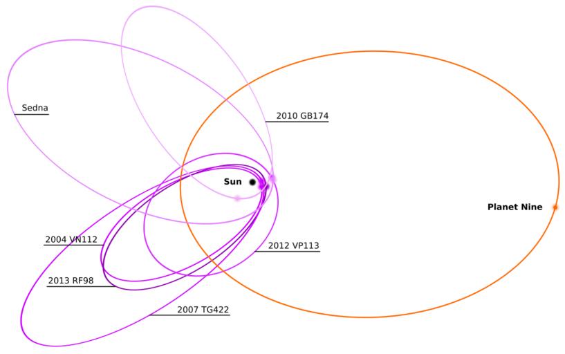 Keywords: Planet Nine Orbit (without background).svg translate yes de Die ungewöhnlich nahe beieinander liegenden Umlaufbahnen von sechs der am weitesten entfernten Objekte im Kuipergürtel deuten auf die Existenz eines neuten Planeten dessen Gravitation diese Bewegungen beeinflusst en The unusually closely spaced orbits of six of the most distant objects in the Kuiper Belt indicate the existence of a ninth planet whose gravity affects these movements fr Les orbites inhabituellement étroitement espacés de six des objets les plus éloignés dans la ceinture de Kuiper indiquent l'existence d'une neuvième planète dont la gravité affecte ces mouvements Planet Nine Orbit svg 50 by user MagentaGreen 2016-01-22 Karl432 cc-zero File Planet Nine Orbit without background -af svg 150 Afrikaans version Planet Nine Orbits Sedna 2012 VP113 |