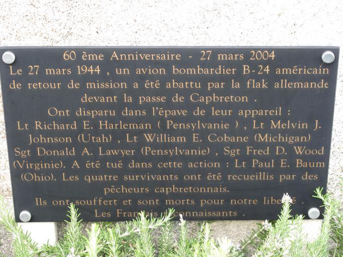Keywords: Plaque B-24 Capbreton.jpg en Plaque in Capbreton Landes France in memory of a US bomber B-24 shot down after a mission over Germany during WWII on march 27 1944 The text is On march 27th-1944 a US bomber B-24 back from a mission was shot down by german anti-aircraft artillery in front of Capbreton Disappeared in the crash Lt Richard E Perleman Pennsylvania Lt Melvin J Johnson Utah Lt William E Cobane Michigan Sgt Donald A Lawyer Pennsylvania Sgt Fred D Wood Virginia Was killed in this action Lt Paul E Baum Ohio 4 surviving soldiers were rescued by local sailors They suffered and died for our liberty The survivors were captured by german once ashore fr Plaque à Capbreton Landes en mémoire d'un bombardier US B-24 abattu au retour d'une mission sur la base aérienne de Mont-de-Marsan pendant la Seconde Guerre Mondiale le 27/3/1944 Touché par la flak peu après le bombardement il avait essayé de rejoindre l'Espagne mais volant trop bas il fut abattu par l'artillerie cotière de Capbreton Les 4 survivants recueillis par les pêcheurs capbretonnais furent faits prisonniers par les allemands à leur arrivée à terre own Tangopaso 2011-10-20 12 03 06 43 654163 -1 440722 region FR_heading NW Capbreton Plaques in Landes Plaques referencing 1944 in France B-24 Liberator in art |