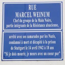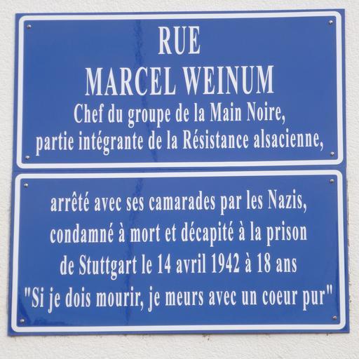 Keywords: Plaque de -rue Marcel Weinum (Neudorf)-02.JPG 48 56664 7 75502 left Rue Marcel Weinum chef du groupe de la Main Noire partie intégrante de la résistance alsacienne arrêté avec ses camarades par les Nazis condamné à mort et décapité à la prison de Stuttgart le 14 avril 1942 à 18 ans Quoted text Si je dois mourir je meurs avec un cœur pur Panneau de la rue 80 <br /> 2012-02-18 own Paralacre cc-zero Uploaded with UploadWizard Marcel Weinum Street signs in Strasbourg Neudorf Strasbourg Plaques referencing 1942 Pictures by User Paralacre