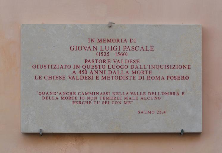 Keywords: Plaque Giovan Luigi Pascal, Rome, Italy.jpg Giovan Luigi Pascal pasteur vaudois condamné à mort et exécuté comme hérétique par l'Inquisition en 1560 Rome Italie Giovan Luigi Pascal who was a waldense pastor sentenced to death and executed as heretic by the roman catholic Inquisition in 1560 Rome Italy 2013-08-23 for photograph own Jebulon 41 901071 12 46665 cc-zero Uploaded with UploadWizard Waldensians in Italy Plaques in Rome Plaques referencing 1560 Plaques referencing 1526 Psalm 23 Inquisition Quality images by Jebulon QualityImage |