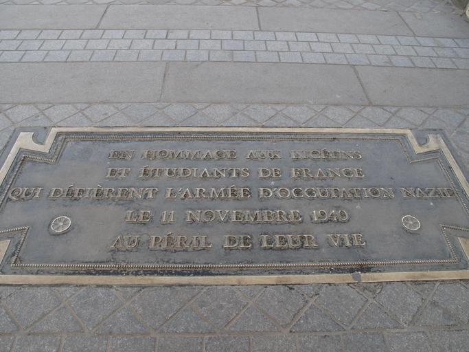 | Keywords: Plaque manifestation des étudiants du 11 novembre 1940.jpg en Plaque in memory of the demonstration of the students on november 11 1940 It was the first annivesary of the armistice of 1918 during the occupation of Paris by the nazis This plaque is on the ground near the grave of the Unknown Soldier at the Arc de Triomphe de l'Étoile in Paris fr Plaque commémorant la manifestation des étudiants du 11 novembre 1940 pour le premier anniversaire de l'Armistice de 1918 pendant l'occupation nazie Près de la tombe du soldat inconnu à l'Arc de Triomphe de l'Étoile de Paris own Tangopaso 2011-05-16 48 52 25 42 N 2 17 41 84 E region FR_heading WNW Tomb of the Unknown Soldier in Paris Plaques in Paris 8e arrondissement Metal plaques in Paris Plaques referencing 1940 Demonstration by students in Paris 11 November 1940 Plaques commemorating the French Resistance Bronze plaques |