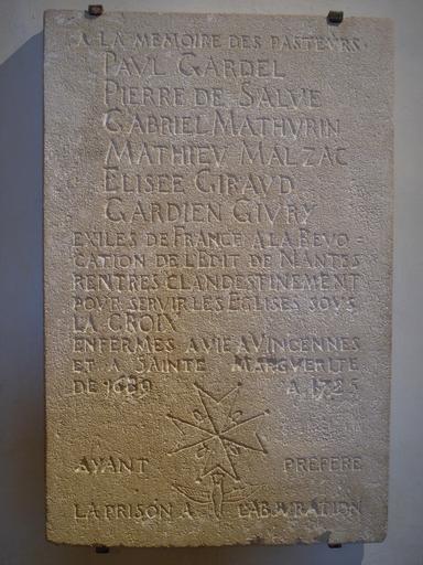 Keywords: Plaque Memorial huguenot.jpg en Plaque in memory of the huguenot pastors arbitrarily kept in the prison of the fort-Royal of the Sainte-Marguerite island Alpes-Maritimes France Édit de Nantes <br> rentrés clandestinement pour servir les Églises sous la Croix<br> enfermés à vie à Vincennes et à Sainte-Marguerite de 1689 à 1725<br> Ayant préféré la prison à la libération<br> own Tangopaso 2013-04-12 Fort royal de l'île Sainte-Marguerite Plaques in Alpes-Maritimes Huguenots in art History of Protestantism Here-lived plaques in France Plaques referencing 1689 Plaques referencing 1725 |