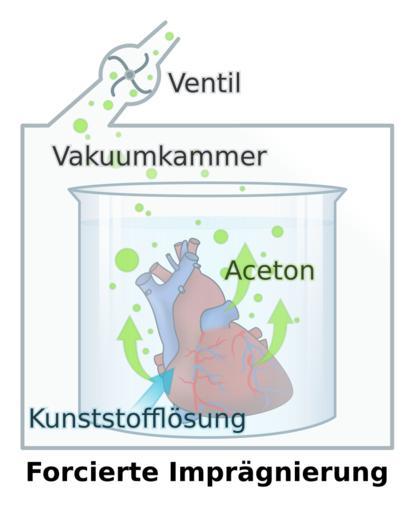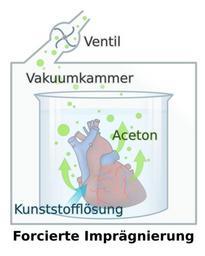 Keywords: PlastinationProcess DE.svg en The centerpiece of plastination forced impregnation In a vacuum acetone trickels out of the tissue creating a volume deficit in the specimen which allows it to be permeated by the plastic German version de Der Kern der Plastination die forcierte ImprÀgnierung Hierbei wird das PrÀparat in einer Kunststofflösung unter Vakuum gesetzt Durch den hohen Dampfdruck fÀngt das Aceton an zu sieden und perlt aus dem PrÀparat heraus Dadurch entsteht ein Volumendefizit und das gleiche Volumen an Kunststoff wird ins Gewebe hinein gesaugt Das PrÀparat ist danach vollkommen mit Kunststoff durchtrÀnkt und wird eventuell in die anatomisch richtige Stellung gebracht Own DooFi 2009 <gallery>File PlastinationProcess_EN svg English Version</gallery> Anatomy SVG diagrams in German SVG anatomy Gunther von Hagens Vacuum |