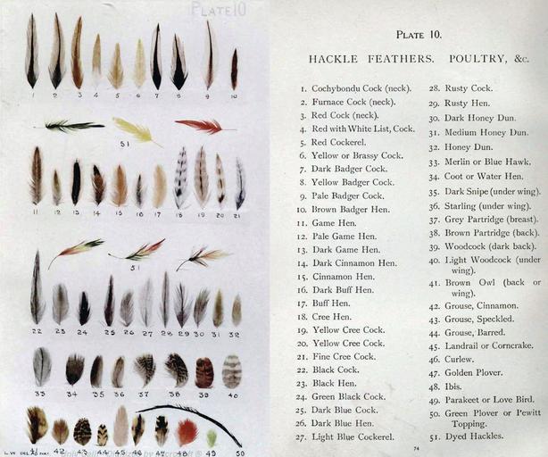 Keywords: Plate10-Hackles, Feathers.JPG Plate 10 - Hackles Feathers and Poultry from The Natural Trout Fly and Its Imitation 1912 Extracted from PDF version of above work on the Internet Archive 2008-03 Mike Cline PD-old Fly tying