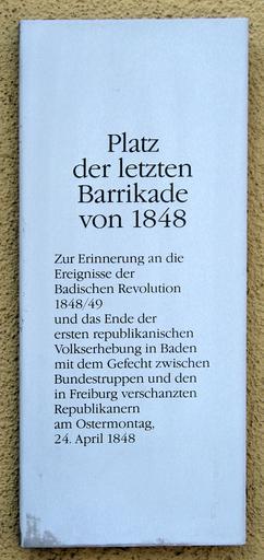 Keywords: Platz der letzten Barrikade.JPG Square of the last barricade during the 1848 Revolution near the Schwabentor Source self-made Date 18 01 2008 Author Manfredjohannes 2007-04-02 own assumed Manfredjohannes 47 59 34 44 N 7 51 14 52 E scale 781_type landmark_region DE History of Freiburg im Breisgau 1848 |
