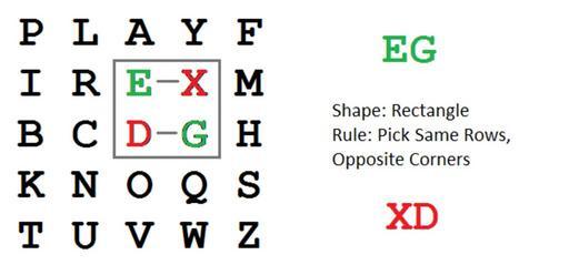 Keywords: Playfair Cipher 04 EG to XD.png SVG Playfair Cipher Example Step 4 own 2010-07-06 Davidtheterp Playfair Cryptography cc-zero