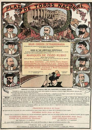 | Keywords: Plaza de toros nacional, de Xaudaró.jpg Plaza de toros nacional en la revista satírica española Gedeón 1904 4 2 Gedeón Plaza de toros nacional 436 6 http //hemerotecadigital bne es/issue vm id 0003064651 page 6 date 1904 4 2 1889-8734 Creator Joaquín Xaudaró PD-Scan PD-old-auto-1923 1933 Caricatures by Joaquín Xaudaró in Gedeón 1904 in Spain José Sánchez Guerra caricatures Arsenio Linares y Pombo Guillermo de Osma y Scull Antoni Maura caricatures Manuel Allendesalazar Joaquín Sánchez Toca caricatures Lorenzo Domínguez Pascual Faustino Rodríguez-San Pedro José Ferrándiz y Niño Political cartoons of Spain |