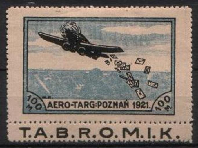 Keywords: Poland 1921 Aero-Targ II.JPG Aero-Targ Company in agreement with the Polish Ministry of Post Telegraph Aero-Targ stamps had to be bought for airmail in addition to the normal express postage rate payable by usage of regular Polish stamps The stamp was designed by Wilhelm Rudy initials W R on the stamps and crudely lithographed Perforated 11 25 but also known imperforated This 100 mark value shows a Junkers F-13 plane dropping mail over Poznan Attached to each stamp was an advertising label inscribed T A B R O M I K for vodka factory TAdeusz BROnislaw MIKolajczyk The first flights from Poznan to Gdansk and to Warsaw were on 29 May 1921 The first return flight from Warsaw to Poznan was on 31 May 1921 There were daily return flights until June 16 1921 A special winged postmark was used from May 29 to June 16 1921 at the Poznan Fair Flights Postmarks with dates after June 16 1921 are fake date Scan of original author PD-old Counterfeit stamps of Poland Philatelic fakes and forgeries Blue stamps