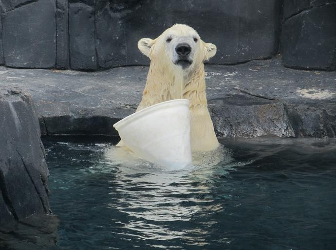 Keywords: polar bear portrait wildlife looking swimming playing bucket nature wild mammal predator ursus maritimus zoo enclosure