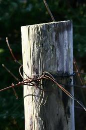 Keywords: pole wood wire fence worn rusty aged old corrosion