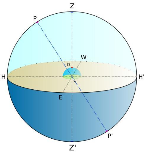 Keywords: Poli celesti.svg Sfera celeste sono evidenziati i poli celesti e i poli dell'orizzone P è il polo celeste elevato P' il polo celeste depresso Z lo Zenith Z' il Nadir C il centro della Terra e della sfera celeste O l'osservatore sulla superficie terrestre Celestial sphere with poles C is the center of the celestial sphere O is the observer Own 2006-12-08 CAV <gallery> Calotte celesti visibile e invisibile svg Emisferi celesti svg Hemisferio celeste svg Poli celesti svg </gallery> Astronomy sketches Celestial coordinate systems Celestial spheres |