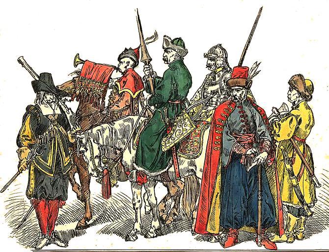 | Keywords: Polish soldiers 1633-1668.PNG en Polish soldiers 1633-1668 http //www bibliotekacyfrowa pl/dlibra/doccontent id 6485 dirids 1 Creator Jan Matejko < 1893 PD-old-100 Ubiory w Polsce by Jan Matejko Military uniforms of Poland I RP Polish Winged Hussars ImageNote 1 59 249 233 654 1184 905 2 Muszkietnik cudzoziemskiego autoramentu ze strzelbą w lewej ręce - w czarnym płaszczyku obszytym na dole i wzdłuż rozpięcia z przodu złotą taśmą Rękawy okrycia z wałkami przy ramionach rozcięte do mankietów Biały gładki kołnierz wyłożony na kołnierz płaszcza Na nogach muszkietnika czarne spodnie zdobione złotą pasmanterią i guzikami na zewnętrznej linii zeszycia oraz czerwone pończochy i buty z kokardą na podbiciu Dłonie osłaniają rękawice Na głowie wysoki filcowy kapelusz z szerokim rondem Przez ramię mężczyzny przewieszony pas na amunicję ушкете иност анного авто амента ImageNoteEnd 1 ImageNote 2 375 151 178 290 1184 905 2 Trębacz na koniu - w brązowym giermku zapinanym z przodu na pętlice i guzy czerwonej krótkiej pelerynce lamowanej na dole złotą taśmą i czerwonej czapce z futrzanym otokiem i piórem z Wjazdu Ossolińskich do Rzymu ze sztychu Stefana della Belli Т убач изоб ажение основано на эстампе Стефано делла Белли Въезд Оссолинского в Рим ImageNoteEnd 2 ImageNote 3 764 228 252 674 1184 905 2 Hajduk z toporem - w krótkim kaftanie z szerokimi rękawami zdobionym z przodu czerwonymi guzami i niebieskich hajdawerach szarawarach wyłożonych na wierzch czerwonych safianych butów Widoczny czerwony sukienny pas Na ramionach czerwona delia z szamerowaniem - dziewięcioma pętlicami i guzami Przy czapce z futrzanym otokiem egreta ze sztychu w zbiorze Ambrożego Grabowskiego Гайдук изоб ажение основано на эстампе из коллекции Амб озия Г абовского ImageNoteEnd 3 ImageNote 4 509 125 355 369 1184 905 2 Всадники изоб ажения основаны на Исто ии шведских войн Пуффендо фа ImageNoteEnd 4 ImageNote 5 973 252 190 633 1184 905 2 Mężczyzna z czekanem - ubrany w żółty kaftan przewiązany czerwonym pasem do którego przywiązana jest szabla Wąskie spodnie włożone w wysokie żółte buty Na głowie czapka z okrągłym denkiem i szerokim otokiem z futra z Historii wojen szwedzkich Puffendorfa Пеший шляхтич изоб ажение основано на Исто ии шведских войн Пуффендо фа ImageNoteEnd 5 ImageNote 6 455 110 240 565 1184 905 2 Jeździec z kopią Ubrany w ciemno-zielony żupan przewiązany czerwonym pasem przy którym zawieszona jest szabla i łuk Na głowie mężczyzny zielona czapka z futrzanym otokiem wyższym z przodu z Historii wojen szwedzkich Puffendorfa ImageNoteEnd 6 ImageNote 7 699 139 131 218 1184 905 2 Rycerz na koniu - ubrany w zbroję płytową i szyszak husarski z Historii wojen szwedzkich Puffendorfa ImageNoteEnd 7 |