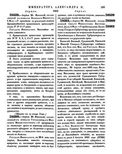 | Keywords: Polnoe sobranie zakonov Rossijskoj imperii - Sobranie 2 Т 38 otd 1 nr 39561 - p 399 - 1863 AD.jpg en Complete Collection of Laws of the Russian Empire Vol 2 Т 38 nr 39561 - page 399 1863 AD ru Полное соб ание законов Российской Импе ии Соб ание Вто ое Т 38 отделение 1 ст аница 399 39561 1863 год be Поўны збо законаў Расійскай імпе ыі Збо д угі Т 38 аддзяленне 1 ста онка 399 39561 1863 год http //www runivers ru/lib/book3136/9940/ - free digital library Russian imperial office 1866 public domain free литовские губе нии бело усские губе нии Севе о-Западный к ай Паўночна-Заходні к ай літоўскія губе ні бела ускія губе ні ихаил иколаевич у авьев Виленское гене ал-губе нато ство виленский гене ал-губе нато іхаіл ікалаевіч у аўёў Віленскае гене ал-губе ната ства віленскі гене ал-губе нато PD-old Northwestern Krai January Uprising documents |