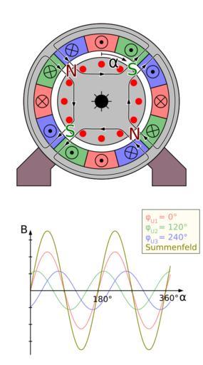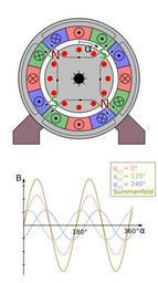 Keywords: Polpaar zahl 2 2.svg de 4-polige Asynchronmaschine mit drei Strängen und darunter ein Diagramm das die Feldstärke im Luftspalt zwischen Rotor und Stator zeigt als Summe und zerlegt in die einzelnen Anteile der Stränge in dem Moment bei der die rot gezeichnete Phase im Maximum steht Durch spezielle Wickeltechnik hat die Feldstärke einen sinusförmigen Verlauf <br/> siehe de Polpaarzahl Own Biezl File Polpaar_zahl_2 svg Inkscape SVG electric motors |