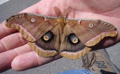 Keywords: PolyphemusFlashingJune6th2009.png en This is a polyphemus moth in the process of defensively flashing his underwings to show the eyespots and trembling them for added effect The motion did not cause blur due to the sunniness of the morning it allowed the camera's automatic exposure process to use a fast shutter speed as well as a small aperture and therefore a tight depth of focus He had been sleeping perched on an exterior lamp I coaxed him off gently with a twig He gradually awoke eventually giving me this defensive display for about 2 seconds and then flew off to a safer roost under a deck Own Organic 2009-06-06 The exact location 43 1 11 40 N 76 11 32 00 W I have assessed the moth as male due to the large size of the antennae I was able to measure corresponding points on my hand to conclude that his wingspan is very close to exactly 6 inches Antheraea polyphemus Insect eyespot