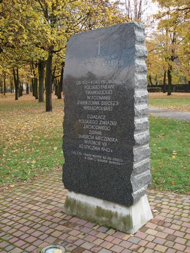 Keywords: Pomnik Manitiusa.jpg Kamień pamiątkowy ks Gustawa Manitiusa 1880-1940 przy ul Grunwaldzkiej w Poznaniu 2002 Gedenkstein für Pastor Gustav Manitius 1880-1940 in Poznań Grunwaldzka Strasse 2002 Memorial stone for Rev Gustaw Manitius 1880-1940 at the Grunwaldzka Street in Poznań 2002 own 2007-10-21 Jerzy Grace Evangelical Lutheran Church in Poznań Monuments and memorials in Poznań Manitius Park in Poznań |