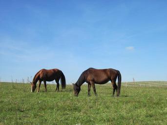 Keywords: ponies graze pasture relaxed brown fuchs sky summer meadow