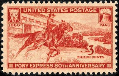 MAKE A MEME View Large Image Pony Express 3c 1940 issue.JPG en Image of A 3-cent red brown commemorative stamp issued on April 3 1940 commemorating the 80th anniversary of the founding of the Pony Express 1940-04-03 US Post Office; Smithsonian National Postal Museum ...