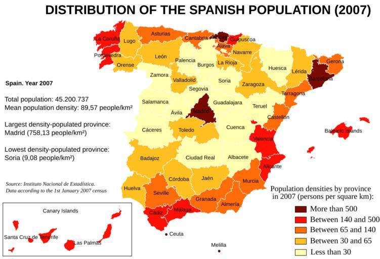 Keywords: Population densities in Spain (2007).svg Map of Spain showing the population densities by province according to the 1st January 2007 Instituto Nacional de Estadística census Instituto Nacional de Estadística de España http //www ine es/inebase/cgi/um M 2Ft20 2Fe260 O inebase N L 2008 Created by Rodriguillo from Image Provinces of Spain svg created by Emilio Gómez Fernández Image Densidades de población en España 2007 svg in Spanish Rodriguillo Population density maps of Spain English language maps of Europe 2007 maps of Spain |