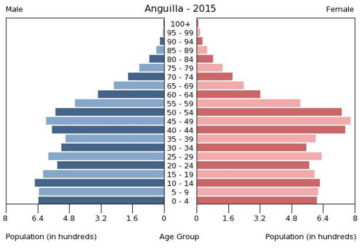 | Keywords: Population pyramid of Anguilla 2015.png en A population pyramid illustrates the age and sex structure of population and may provide insights about political and social stability as well as economic development The population is distributed along the horizontal axis with males shown on the left and females on the right The male and female populations are broken down into 5-year age groups represented as horizontal bars along the vertical axis with the youngest age groups at the bottom and the oldest at the top The shape of the population pyramid gradually evolves over time based on fertility mortality and international migration trends Віково-статева пі аміда населення Ангільї за 2015 ік Вона дає наочне уявлення п о вікову і статеву ст укту а населення к аїни може слугувати дже елом інфо мації п о політичну і соціальну стабільність економічний озвиток Блакитними кольо ами ліво уч у вигляді го изонтальних смуг показані вікові г упи по 5 оків кожна чоловічої статі п аво уч ожевими жіночої аймолодші вікові г упи внизу найста іші вго і Фо ма пі аміди поступово еволюціонує з плином часу під впливом чинників на оджуваності сме тності і світової міг ації https //www cia gov/library/publications/the-world-factbook/ The World Factbook 2016-09-21 The Central Intelligence Agency Цент альне озвідувальне уп авління PD-USGov Population pyramids of Anguilla |