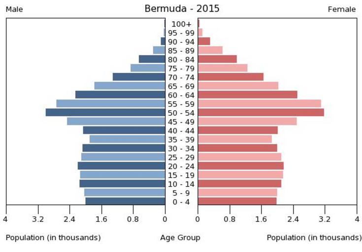 | Keywords: Population pyramid of Bermuda 2015.png en A population pyramid illustrates the age and sex structure of population and may provide insights about political and social stability as well as economic development The population is distributed along the horizontal axis with males shown on the left and females on the right The male and female populations are broken down into 5-year age groups represented as horizontal bars along the vertical axis with the youngest age groups at the bottom and the oldest at the top The shape of the population pyramid gradually evolves over time based on fertility mortality and international migration trends Віково-статева пі аміда населення Бе мудських Ост овів за 2015 ік Вона дає наочне уявлення п о вікову і статеву ст укту а населення к аїни може слугувати дже елом інфо мації п о політичну і соціальну стабільність економічний озвиток Блакитними кольо ами ліво уч у вигляді го изонтальних смуг показані вікові г упи по 5 оків кожна чоловічої статі п аво уч ожевими жіночої аймолодші вікові г упи внизу найста іші вго і Фо ма пі аміди поступово еволюціонує з плином часу під впливом чинників на оджуваності сме тності і світової міг ації https //www cia gov/library/publications/the-world-factbook/ The World Factbook 2016-09-21 The Central Intelligence Agency Цент альне озвідувальне уп авління PD-USGov Population pyramids of Bermuda |