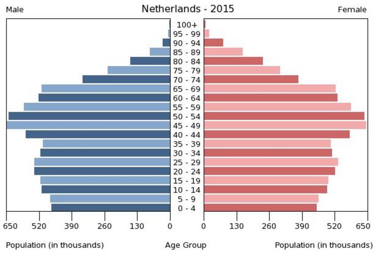 | Keywords: Population pyramid of Netherlands 2015.png en A population pyramid illustrates the age and sex structure of population and may provide insights about political and social stability as well as economic development The population is distributed along the horizontal axis with males shown on the left and females on the right The male and female populations are broken down into 5-year age groups represented as horizontal bars along the vertical axis with the youngest age groups at the bottom and the oldest at the top The shape of the population pyramid gradually evolves over time based on fertility mortality and international migration trends Віково-статева пі аміда населення іде ландів за 2015 ік Вона дає наочне уявлення п о вікову і статеву ст укту а населення к аїни може слугувати дже елом інфо мації п о політичну і соціальну стабільність економічний озвиток Блакитними кольо ами ліво уч у вигляді го изонтальних смуг показані вікові г упи по 5 оків кожна чоловічої статі п аво уч ожевими жіночої аймолодші вікові г упи внизу найста іші вго і Фо ма пі аміди поступово еволюціонує з плином часу під впливом чинників на оджуваності сме тності і світової міг ації https //www cia gov/library/publications/the-world-factbook/ The World Factbook 2016-09-21 The Central Intelligence Agency Цент альне озвідувальне уп авління PD-USGov Population pyramids of the Netherlands |