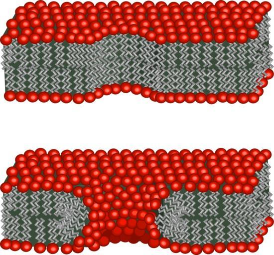 Keywords: Pore schematic.svg en Diagram of possible lipid arrangements at the edge of a pore through a lipid bilayer above In the absence of any re-arrangement the pore walls will be hydrophobic since the alkane tails are exposed below Some researchers believe that the lipids at the edge re-orient to line the pore wall with hydrophilic head groups Own MDougM 2009-02-12 Lipids Ultrastructure diagrams Cell membrane Molecular biology Biomechanics Lipid bilayers |