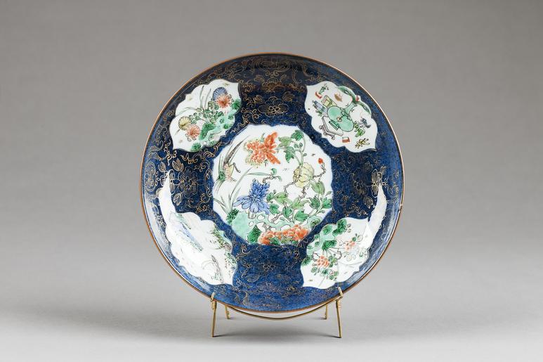 | Keywords: Porslinsfat med famille verte gröna familjen - Hallwylska museet - 100927.tif LSH artwork sv FAT Runt skålformigt på låg fotkant Dekor i famille verte gröna familjen i fem utsparda konturerade fält mot mörkblå botten på denna växtornament i konturteckning i guld I mittenfältet en klippa krysantemumblommor en fågel I två av de omgivande fälten blommor i ett landskap med båt i det handra några av de hundra dyrbarheterna po ku Mellan fälten i guld tre enkla blommor; kring brädden en guldrand Bräddkanten i brunt Utsidan blå botten vit Glasyren på ett par ställen med obetydliga ojämnheter på bottens utsida ett långsträckt sår tillverkningsfel <br/>Inköpt av Wilhelmina von Hallwyl från konsthandlaren J Bosshard Luzern Schweiz 1911 ur August Edward Jessup 1861-1925 samling<br/>Porcelain dish with cobalt blue glaze overglaze enamel decoration and gilding<br/>Qing dynasty Kangxi period 1662-1722 <br/>Complex decoration in this style was popular because of its opulence First the dish had cobalt blue glaze blown onto the surface through a bamboo tube to give an effect called powder blue Shaped cartouches were left reserved in the blue glaze and the rim was dressed to strengthen it Then the dish was fired in a high-temperature kiln Delicate enamelled designs were painted within the cartouches and the dish was fired again at a lower temperature Then the blue-glazed portions were gilded and the piece was fired a third time original caption Porslinsfat med famille verte gröna familjen <br/> Nyckelord Föremålsbild Fat Porslin - 1662 1722 size mm 26 5 HWY place of origin CN original filename hm_dig16353 15421 inventory number HWY XLVIII VIII B e c 06 100927 CC-BY-SA Jens Mohr <gallery caption Different images of same object > File Baksidan av fat - Hallwylska museet - 100928 tif </gallery> Plates Porcelain Chinese ceramics in the Hallwyl Museum Sweden Glass Vessel container Ceramics of Korea Ceramics of Japan Ceramics Jens Mohr Media contributed by LSH 2015-11 |