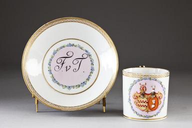 Keywords: Porslinsfat och kopp med ätterna Trusches von Wetzhausens och Gerhan von Kepplas vapen - Hallwylska museet - 93869.tif LSH artwork sv Cylinderformig något avsmalnande nedåt samt med insänkt botten Dekor i form av ätterna Trusches von Wetzhausens och Gerhan von Kepplas vapen i färger och guld på glasyren Fat med snett utstående kant och insänkt botten samt med bokstäverna F v T på fatets ovansida Fabriken grundlagd 1757 av Wilhelm Teodor von Rothberg Såldes senare till August von Gotha 1802 som 1813 sålde fabriken vidare till Egidius Hemmeberg Pris 12 Mk original caption Porslinsfat och kopp med ätterna Trusches von Wetzhausens och Gerhan von Kepplas vapen från 1790-1805 <br/> Nyckelord Thuringen Europa Guldkant Lila Heraldik Porslin Föremålsbild ca other date - 1790 1805 size cm 2 8 fat size cm 6 4 kopp size cm 6 4 size cm 13 5 fat HWY place of origin Gotha Thüringen DE original filename hm_dig3928 17874 inventory number HWY XLVII XII H b 01 93869 CC-BY-SA Jens Mohr Heraldry Porcelain of Thuringia Gold Purple Porcelain cups and plates Porcelain in the Hallwyl museum Jens Mohr Media contributed by LSH dim-with multiple size templates Media contributed by LSH 2014-11 |