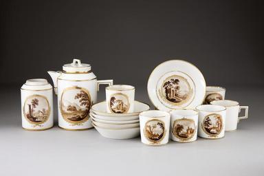 Keywords: Porslinsservise gjord i Thüringen 1790-1805 - Hallwylska museet - 93884.tif LSH artwork sv Servis ej komplett bestående av kaffekanna med lock teburk lock saknas sex koppar och sex fat Dekor av ovala medaljoner med landskap i brun camaïeu på glasyren samt i guld <br/>Mått Kaffekanna H 15 utan lock H 13 3 D 8 6 Lock H 2 6 D 6 2 Teburk H 10 5 D 6 8 Koppar H 5 8- 6 D 6 3 Fat H 2 6 -2 8 D 12 5-12 8 <br/>Fabriken grundlagd 1757 av Wilhelm Teodor von Rothberg Såldes senare till August von Gotha 1802 som 1813 sålde fabriken vidare till Egidius Hemmeberg <br/>Pris 55 Mk Se rescontra Walther v H 23 aug 1900 Se även Uhses reseant 11 aug 1900 original caption Porslinsservise gjord i Thüringen 1790-1805 <br/> Nyckelord Servis Föremålsbild Porslin - 1790 1805 HWY place of origin Gotha Thüringen DE original filename hm_dig3942 17726 inventory number HWY XLVII XII H c 01 93884 CC-BY-SA Jens Mohr Porcelain Crockery Porcelain in the Hallwyl museum Jens Mohr Media contributed by LSH 2014-11 |