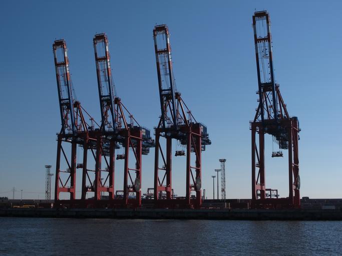 Keywords: port cranes hamburg port elbe harbour cranes river water technology crane ship transport shipping container ship