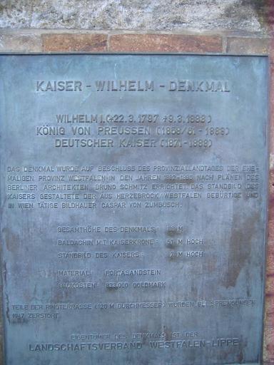 | Keywords: Porta Westfalica, 2009-Nov 070.jpg Das Kaiser-Wilhelm-Denkmal an der Porta Westfalica auf dem Wittekindsberg und über dem Weserdurchbruch žPorta Westfalica bei der gleichnamigen Stadt Porta Westfalica Kreis Minden-Lübbecke Nordrhein-Westfalen Wilhelm I monument near Porta Westfalica District of Minden-Lübbecke North Rhine-Westphalia Germany Mémorial pour Guillaume Ier d'Allemagne près de Porta Westfalica arrondissement de Minden-Lübbecke Rhénanie-du-Nord-Westphalie Allemagne TUBS/Translation own IXUS 500 2009-11-20 TUBS 52 14 44 3 N 8 54 19 06 E region DE_heading S TUBS GFDL cc-by-3 0 2 5 2 0 1 0 cc-by-sa-3 0 2 5 2 0 1 0 TUBS/Credits Kaiser-Wilhelm-Denkmal an der Porta Westfalica Plaques in Kreis Minden-Lübbecke |