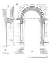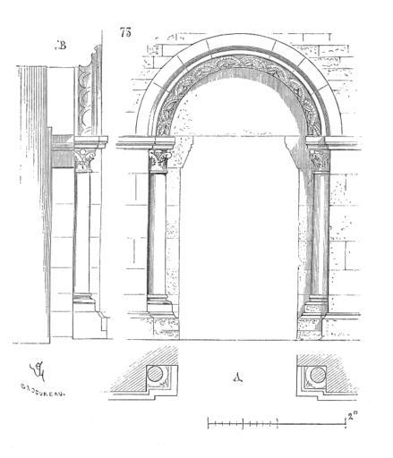 Keywords: Porte.eglise.Beaune.png Sur le flanc sud de la nef de l'église de Beaune on voit encore une fort jolie porte de ce genre parfaitement conservée Les pieds-droits sont accompagnés de deux colonnettes et l'archivolte est ornée d'un gros boudin sculpté fig 73 Cette porte date de 1140 environ En A nous en donnons le plan et en B la coupe Cette porte possédait deux vantaux Viollet-le-Duc Portals Viollet-le-Duc Romanesque architecture Viollet-le-Duc |