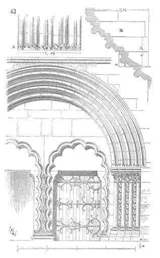 Keywords: Porte.eglise.Montreal.2.png Pendant qu'on élevait les portes que nous avons figurées dans ces deux derniers exemples c'est-à-dire de 1190 à 1200 on bâtissait en Bourgogne près d'Avallon un très-remarquable monument religieux dont nous avons souvent l'occasion de parler la petite église de Montréal Yonne Sa façade occidentale entièrement lisse n'est décorée que par une porte basse large et par une rose La porte se distingue par la singularité de sa composition et par sa sculpture qui est du plus beau style Afin de pouvoir mieux faire apprécier cet ouvrage à nos lecteurs nous adoptons une échelle qui permettra de prendre une idée plus exacte de son caractère et nous ne donnons ainsi que la moitié de l'ensemble fig 63 Viollet-le-Duc Portals Viollet-le-Duc Collégiale Notre-Dame de Montréal Yonne |