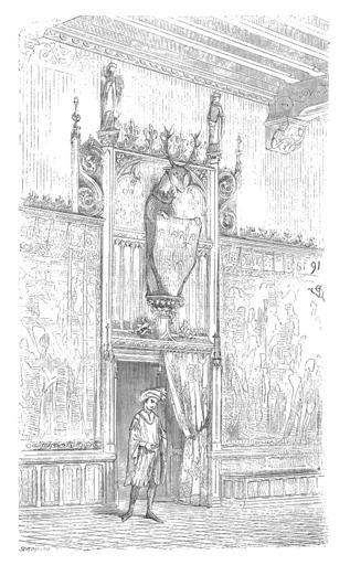 Keywords: Porte.interieure.XIVe.XVe.siecle.png nous avons réuni dans la figure 91 les renseignements recueillis soit dans des édifices civils de la fin du XIV<sup>e</sup> siècle ou du commencement du XV<sup>e</sup> soit dans des vignettes de manuscrits des peintures et des bas-reliefs On voit ici que la porte proprement dite la baie de pierre est à peine visible; les jambages et le bord inférieur de son linteau sont seuls apparents Au-dessus est scellé un grand ouvrage de menuiserie peint et qui se raccorde avec les porte-tapisseries moulurés Ces tapisseries s'arrêtent sur un lambris inférieur qui garnissait genéralement le bas des murs La partie du mur laissée nue entre le plafond et les tapisseries était décorée de peintures et une portière était suspendue à la boiserie formant dessus de porte Viollet-le-Duc Portals Viollet-le-Duc Panelling |