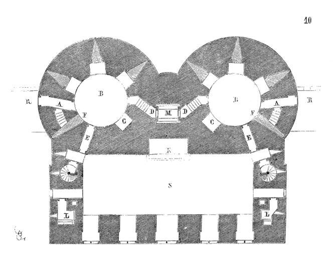 Keywords: Porte.Laon.Coucy.8.png En N est une des trappes donnant dans une trémie qui correspond à l'étage en sous-sol Deux escaliers pris dans l'épaisseur des murs des tours permettent de monter au premier étage dont le plan fig 10 présente une disposition peut-être unique dans l'art de fortifier les portes au moyen âge Les deux escaliers que nous venons de signaler arrivent en A dans deux couloirs donnant sur le chemin de ronde R des courtines et dans les salles rondes B De ces salles rondes on monte au mâchicoulis M percé entre les deux herses par deux degrés D Les salles rondes sont percées de trois meurtrières chacune donnant sur le dehors Viollet-le-Duc Portals Viollet-le-Duc Château de Coucy |