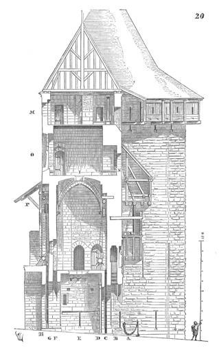 Keywords: Porte.Narbonnaise.Carcassonne.5.png Pour servir la seconde herse il fallait franchir les portes B et se rendre sur la plate-forme P Les servants de cette seconde herse recevaient des ordres du dedans par une petite fenêtre percée au-dessus des mâchicoulis O Les deux salles A sont percées sur les dehors l'une de trois meurtrières l'autre de quatre et éclairées du côté de la ville par deux fenêtres Cette description fait assez connaître le soin minutieux apporté dans l'établissement de cette porte Mais la coupe longitudinale faite sur <i>ab</i> que nous présentons fig 20 rendra encore cette description plus claire Viollet-le-Duc Portals Viollet-le-Duc |