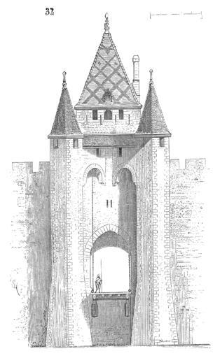 Keywords: Porte.Villeneuve.sur.Yonne.2.png l'élévation extérieure de la porte de Villeneuve-sur-Yonne Cette élévation fait saisir la double fonction des mâchicoulis obliques Toute cette construction est élevée en cailloux de meulière avec chaînes de pierre aux angles Elle est bien traitée et les mortiers en sont excellents C'est peut-être à la bonté de cette construction et au peu de valeur des matériaux que nous devons sa conservation Une coupe longitudinale faite sur la partie antérieure de la porte fig 33 fait voir la manœuvre du pont-levis et son mécanisme Des contre-poids suspendus en arrière des deux longrines du tablier facilitaient son relèvement lorsqu'on appuyait sur le treuil T La première herse abaissée le mâchicoulis qui la protége était ouvert aux défenseurs Dans cet exemple comme dans tous ceux précédemment donnés la défense n'agit que du sommet de la porte et par la disposition des échauguettes et des grands mâchicoulis obliques le fossé ainsi que les abords du pont pouvaient être couverts de projectiles Viollet-le-Duc Portes de Sens et de Joigny Gothic portals |