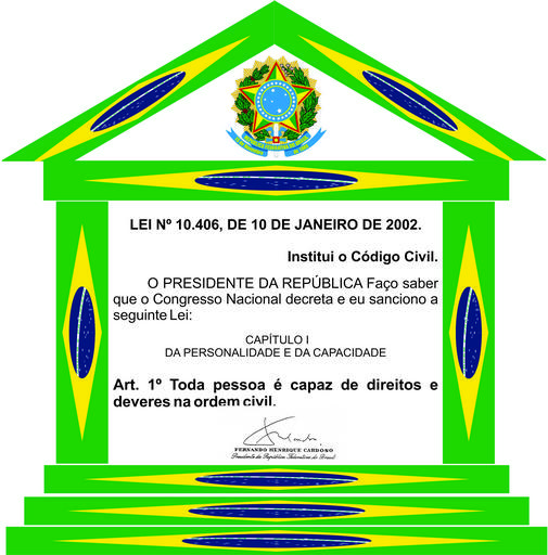 Keywords: Portico do Código Civil Brasileiro de 2002.jpg pt Pórtico cerimonial do Código Civil Brasileiro de 2002 com Bandeira do Brasil contendo o artigo 1ª da Lei nº 10 406 de 10 de janeiro de 2002 own Almanaque Lusofonista 2014 Variations on flags of Brazil Fernando Henrique Cardoso Legislation of Brazil |