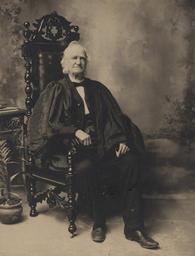 Keywords: portraits people Photographer: Reuben R. Sallows (1855 - 1937) Description: Studio portrait of older man, full-length, seated, facing front; wears black suit, vest, pants, bow-tie, white shirt, black judge's robe; white hair, long side-burns; seated in high-backed ornately carved chair; wicker table with papers and book on left, plus potted plant; painted backdrop; Sallows imprint in lower left corner of matte; writing in ink on back identifies subject: Ira Lewis, Crown Attorney, 1844-1905 Object ID : 0502-rrs-ogohc-ph View additional photographs by Sallows that are held in other collections at the Reuben R. Sallows Digital Library. Order a higher-quality version of this item by contacting the Huron County Museum (fee applies). Photographer: Reuben R. Sallows (1855 - 1937) Description: Studio portrait of older man, full-length, seated, facing front; wears black suit, vest, pants, bow-tie, white shirt, black judge's robe; white hair, long side-burns; seated in high-backed ornately carved chair; wicker table with papers and book on left, plus potted plant; painted backdrop; Sallows imprint in lower left corner of matte; writing in ink on back identifies subject: Ira Lewis, Crown Attorney, 1844-1905 Object ID : 0502-rrs-ogohc-ph View additional photographs by Sallows that are held in other collections at the Reuben R. Sallows Digital Library. Order a higher-quality version of this item by contacting the Huron County Museum (fee applies). |