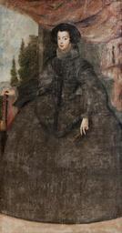 Keywords: Porträtt, Elisabeth av Bourbon, drottning av Spanien - Skoklosters slott - 88978.tif Elisabeth av Spanien drottning plain text Oljemålning på duk <br/>Stående helfigur fas vänster <br/>Svart mönstrad dräkt med styv kjol och liv med stora skört <br/>Hög pipkrage och pipmanschetter Högra handen stöder mot stolsrygg i vänstra solfjäder <br/>I bakgrunden utsikt över landskap upptill och till höger rött draperi <br/>Kilad spännram På lapp på spännramen Velasques hans skola Elisabeth Frankrike <br/> STORA SPANSKA MÄSTARE NR 109 Nationalmuseum Stockholm 1959-60 m m Enl denna katalog Elisabeth av Frankrike drottning av Spanien Återgår på knästycke av Velasques´ atelje På spännramen med svart färg Sk 1 <br/>Blekröd ram med målade ornament i guldbrons Ramlistens bredd 100 mm Ramen ej ursprungligen tillhörande original caption Porträtt Elisabeth av Bourbon drottning av Spanien <br/> Nyckelord Klänning Elisabeth Bourbon Drottningkläder Drottning Spanien Frisyr Målning Föremålsbild Kvinna Drottningar decade 1630 oil on canvas size mm 1060 1985 SKO Carl Gustaf Wrangel place of origin original filename sm_dig3547 24490 inventory number SKO 3172 88978 PD Jens Mohr Jens Mohr Dresses Hair fashion Women in art Portrait paintings Media contributed by LSH unmatched creator Media contributed by LSH unmatched keyword Media contributed by LSH tag as oil on canvas Media contributed by LSH 2013-10 |