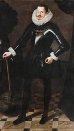 Keywords: Porträtt, Filip III, kung av Spanien - Skoklosters slott - 88964.tif Philip III av Spanien kung plain text Stående helfigur fas vänster Svart rustning med pipkrage och pipmanschetter Svarta strumpor och skor Gyllene skinnets orden Högra handen stöder på en käpp <br/>Mörk bakgrund med svart draperi till höger till vänster hjälm Profilerad ram Bronserad numera ärgad Närmast duken en smal svart list Ramlistens bredd 48 mm <br/><br/>Philip III of Habsburg was King of Spain 1598 to 1621 Here he is seen wearing black armour with the order of the Golden Fleece around his neck In his right hand he holds a baton which is pointed at the globe on the checkered floor The portrait is similar in composition to the knee-length portrait of Philip III executed by Andres Lopez in 1617 now in the Kunsthistorisches Museum in Vienna <br/>The portrait was most likely taken from Prague as war booty by the Swedish army in 1648 original caption Porträtt Filip III kung av Spanien <br/> Nyckelord Kungar Pipkrage Barocken Filip III 1600-tal Herrmode ca 1617 oil on canvas size mm 1030 1810 SKO Carl Gustaf Wrangel place of origin original filename sm_dig3535 24196 inventory number SKO 3175 88964 PD Jens Mohr Philip III of Spain in painted portraits 1617 Jens Mohr Ruffs in art male Black clothing in art male Portrait paintings of men at half length Media contributed by LSH unmatched creator Media contributed by LSH unmatched keyword Order of the Golden Fleece Media contributed by LSH 2013-10 |
