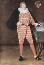 Keywords: Porträtt. Maurits Lewenhaupt - Skoklosters slott - 87270.tif Mauritz Lewenhaupt greve plain text Helfigur fas höger <br/>Röd dräkt med spetsig jacka horisontella vita band och regelbundna uppskärningar mellan banden så att det vita fodret skymtar Nedliggande vit spetskantad krage Kort svart kappa röda strumpor och svarta skor med vita fotlappar Smalt svart midjehäng lång ryttarvärja med förgyllt korgfäste svart balja med förgylld doppsko Handskar i vänstra handen som vilar på bord med grå duk Brun bakgrund upptill till höger grevliga lewenhauptska vapnet Till vänster inskrift MORITZ GRAF RASBORGK FREIHER ZV GREFSNES VNDT KIEGLEHOLM ANNO DOMINO 1596 <br/>Stiftad spännram <br/>Profilerad ram med grönoxiderade bronserade lister Ramlistens 32 mm original caption Porträtt Maurits Lewenhaupt SKO 3013<br/> Nyckelord Man Målning Slängkappa 1500-tal Lewenhaupt Maurits Krage Porträtt Blondin Föremålsbild 1596 oil on canvas size mm 1355 1890 SKO Carl Gustaf Wrangel place of origin original filename sm_dig4909_3013 24349 inventory number SKO 3013 87270 PD Jens Mohr Jens Mohr Men in art Portrait paintings Media contributed by LSH unmatched keyword Media contributed by LSH 2013-10 |