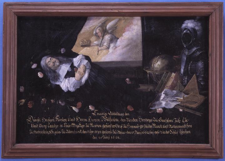 Keywords: Porträtt, Wilhelm av Sachsen-Weimar - Skoklosters slott - 56416.tif Wilhelm av Sachsen-Weimar hertig plain text Lit de parade med huvudet åt vänster <br/><br/>Långt gråsprängt hår mustasch och kort pipskägg <br/><br/>Svart dräkt med vita ärmar och vit nedliggande krage <br/><br/>Svartdraperat rum med strödda rosor och tulpaner m fl blommor kring den döde <br/><br/>Liten blombukett i händerna på bröstet <br/><br/>I fönstret ängel med guldkrona och palmkvist <br/><br/>Vid fotändan jordglob två böcker fästningsritning tekniska instrument och rustning i en grupp <br/><br/>Målad inskrift Trauringe Abbildung des Durchl Hochgeb Fyrsten Und Herrn Herren Wilhelm des Vierden Hartzog Zu Sachsen Iylle Und Berg Landgr im Thyr Magckgr zu Meissen gefyrster Graf zu Henneb GR ZU DER Marck und Ravensverck herr zu Ravenstein Segebo zu Altenvärck den 11 Apr 1598 gestrob zu Weim den 17 Maij 1662 beij gesetz in der Schloss Kirchen den 24 Junij 1662 <br/><br/>Spikad direkt på rödbrunmålad fururam bredd 45 mm original caption Porträtt Wilhelm av Sachsen-Weimar SKO 11733 1662 oil on canvas size mm 670 440 SKO I sömnens famn - Bädd och bolster på Skoklosters slott 2010 Skoklosters slott place of origin original filename sm_t08893 32730 inventory number SKO 11733 56416 PD Samuel Uhrdin Samuel Uhrdin Deathbed portraits Media contributed by LSH 2013-10 |