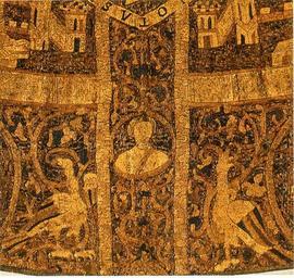 Keywords: Portrayal of Saint Emeric of Hungary in the axis of the coronation pall.jpg author 1031 textile embroidery Institution Hungarian National Museum Budapest object history credit line accession number own scanned by Szilas from A magyar Szent Korona by Tóth Endre Szelényi Károly Kossuth 2000 Budapest PD-old-100 Coronation pall of Hungary |