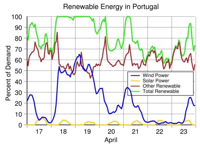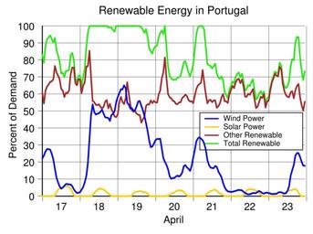 Keywords: Portugal renewable energy production April 17-23 2016.svg translate yes en For over half of the week of May 7-13 2016 all of the electricity used in Portugal was generated from renewable energy A peak of 147 of demand was produced from renewable energy from 6 to 7 am on May 9 Excess electricity was exported when generation exceeded 100 of demand Data source https //transparency entsoe eu/generation/r2/actualGenerationPerProductionType/show entsoe 2016-07-12 own Delphi234 other versions Generated with Wikimedia SVG Chart SVG Chart/box cc-zero Solar energy in Portugal Wind power in Portugal Renewable energy in Portugal May 2016 in Portugal |