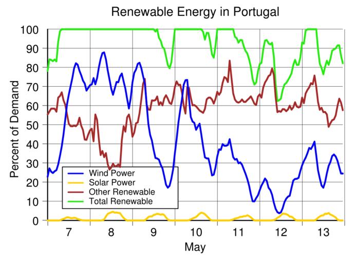 Keywords: Portugal renewable energy production May 7-13 2016.svg translate yes en For two days during the week of April 17-23 2016 all of the electricity used in Portugal was generated from renewable energy A peak of 122 of demand was produced from renewable energy from 6 to 7 am on April 19 Excess electricity was exported when generation exceeded 100 of demand Despite being one of the sunniest countries in Europe solar power is relatively undeveloped in Portugal Data source https //transparency entsoe eu/generation/r2/actualGenerationPerProductionType/show entsoe 2016-07-12 own Delphi234 other versions Generated with Wikimedia SVG Chart SVG Chart/box cc-zero Solar energy in Portugal Wind power in Portugal Renewable energy in Portugal April 2016 in Portugal |