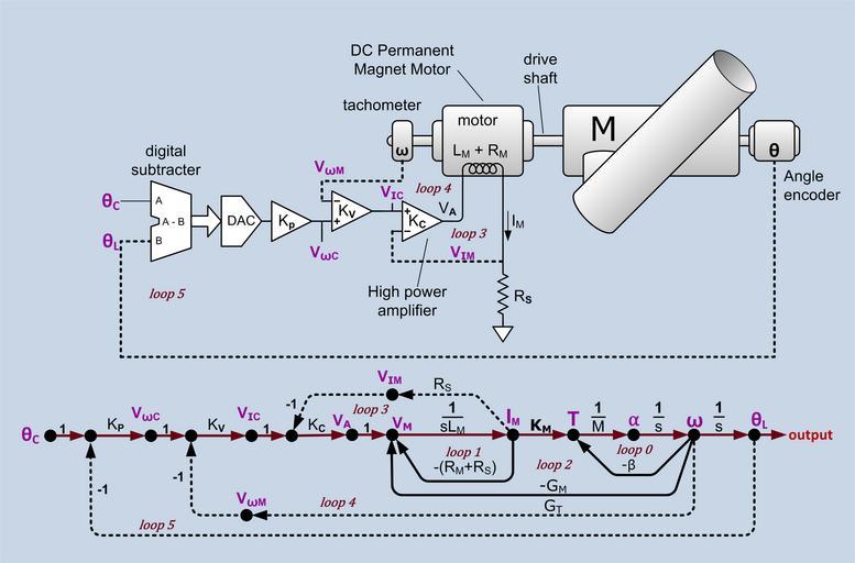 | Keywords: Position servo and signal flow graph.png en Angular position servo and signal flow graph θC desired angle command θL actual load angle KP position loop gain VωC velocity command VωM motor velocity sense voltage KV velocity loop gain VIC current command VIM current sense voltage KC current loop gain VA power amplifier VM voltage applied to motor inductance L motor inductance IM motor current RM motor resistance RS current sense resistance KM motor torque constant Nm/amp T torque M momment of inertia of all rotating components α angular acceleration ω angular velocity β mechanical damping GM motor back EMF constant GT tachometer conversion gain constant There is one forward path shown in a different color and six feedback loops The drive shaft assumed to be stiff enough to not treat as a spring Constants are shown in black and variable in purple own Constant314 2011-03-08 Cc-zero Electronic diagrams Signal flow graphs Servos Control theory |